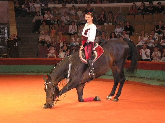 Говорят, что самые трудно обучаемые животные – это кошки, да и вообще любые хищники. Нам приходится изо дня в день иметь дело с травоядными, которые в категорию «непонимашек» отнюдь не входят. Поэтому будем считать, что задача конника, решившего обучить своего питомца нескольким цирковым трюкам на порядок проще. Осталось найти специалиста, поэтому, готовя данный материал мы обратились за помощью к известной дрессировщице, работающей с лошадьми в московском цирке на Цветном бульваре – Елене Павлович. Ее серые терцы выходят на манеж без какой-либо амуниции и, повинуясь незаметным командам мастера, выполняют на свободе массу сложнейших элементов. Нам – «чайникам» в данном вопросе – до такого высшего пилотажа далеко, но как призналась Елена, практически любой желающий, зная принцип и обладая должным терпением сможет научить свою лошадь элементарным трюкам.