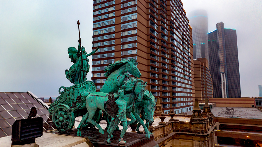 Композиция «Победа и прогресс» на здании окружного суда округа Уэйн в Детроите, США. Автор – Джон Мэсси Райнд. Здание, наряду с прочими скульптурами, украшают две колесницы. По внешнему облику это классические античные квадриги, если бы не одно «но»: в запряжке всего три лошади. Так что правильнее назвать их тройками!