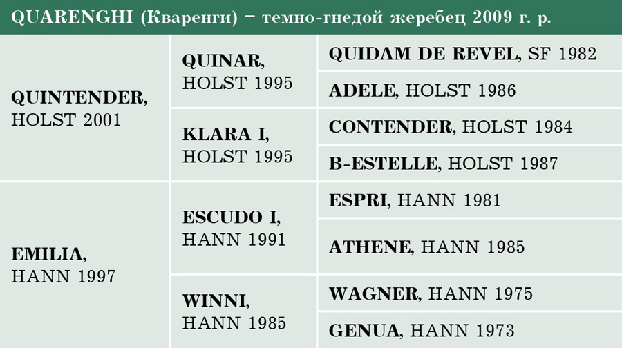Ну а что же Кваренги? Очевидно, эксперимент оказался удачным. Всей своей историей и победой на чемпионате России в том числе он подтвердил правильность того давнего селекционного решения, которое было таким непростым. Его автор изучил очень много детей Квинтендера: посещал аукционы и керунги, записывал, анализировал статистику. Настоял на покупке Эмилии и получении от нее жеребенка.
