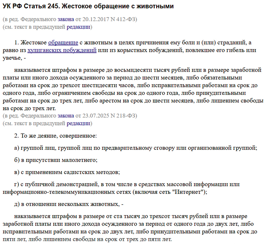 Выдержки из нормативных актов, касающихся жестокого обращения с животными: ст. 245 УК РФ