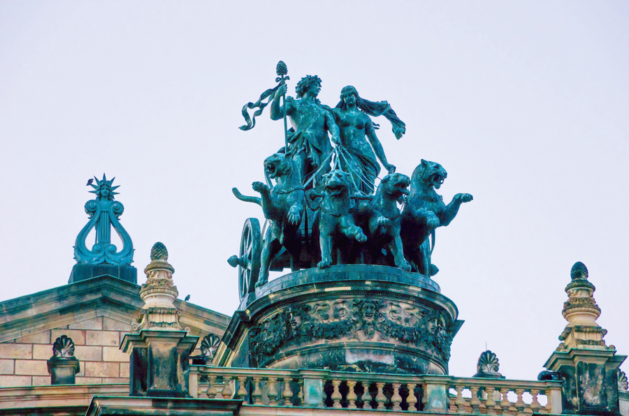 Квадрига над главным входом в здание Саксонской государственной оперы в Дрездене. Автор – Иоганнес Шиллинг. Вместо лошадей колесницу Диониса и Ариадны везут пантеры (фото: imago images/Ullrich Gnoth)