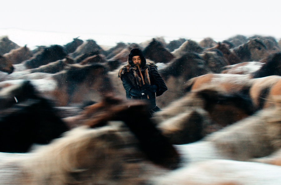 Сцена, где Вы играете на курае в центре движущегося табуна, выглядит захватывающе и требует высочайшей координации. Как происходили съемки?