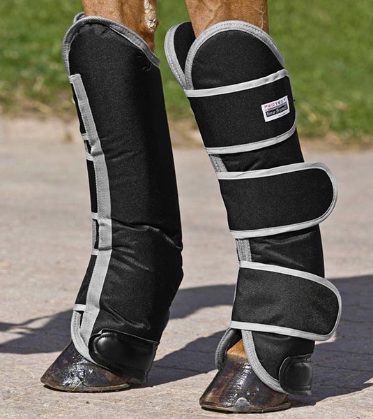 Лечебные ногавки помогают справиться с различными проблемами или предотвратить их появление. Существуют ногавки с карманами для охлаждающих и разогревающих пакетов, с массажным эффектом, магнитные ногавки, которые снимают воспаление и отеки и стимулируют кровообращение, и биокерамические ногавки, купирующие болевой синдром и хронические воспалительные процессы. К этой же категории можно отнести ортопедические ногавки. Обычно они изготавливаются из неопрена с тремя липучками вокруг ноги и еще одной снизу, которая как бы «подхватывает» путовый сустав. Внутри они имеют силиконовый валик, который держит сухожилие и одновременно обеспечивает массажный эффект. Такие ногавки не впитывают пот и снижают ударные нагрузки на копыта при прыжках. Лечебные ногавки отличаются по цене в зависимости от функций и стоят в среднем от 2 тыс. руб. (с карманами) до 12 и выше (массажные).